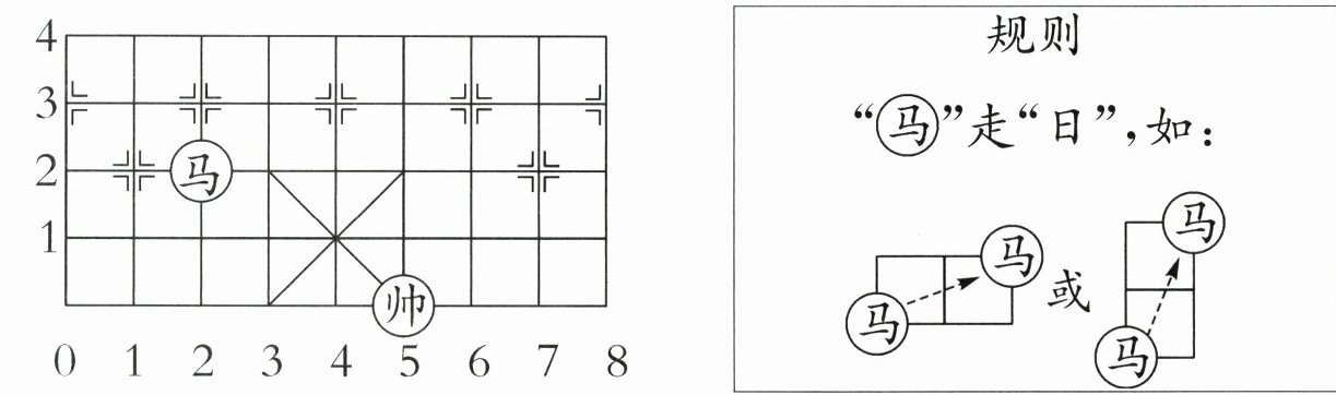 5. 下面是中国象棋棋盘的一部分,“马”在数对(2,2)的位置。根据规则,“马”的下一步可以走到的位置是(