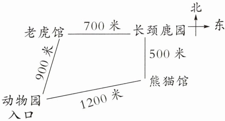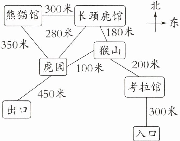 从入口进入,先向北走 300 米到考拉馆,再向西北方向走 200 米到猴山,然后向西北方向走 180 米到长颈鹿馆,接着向西走 300 米到熊猫馆,再接着向东南方向走 350 米到达虎园,最后向西南方向走 450 米到达出口。