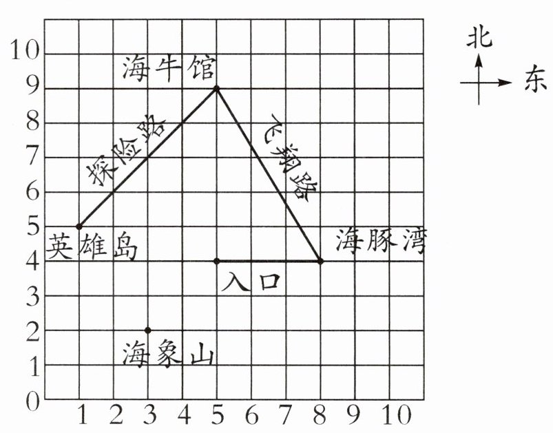 (1)东 300 [提示]3×100=300(米),奇思在入口处可以向东走300米到海豚湾。(2)(3,2) [提示]用数对表示位置,第一个数字表示列,第二个数字表示行。(3)