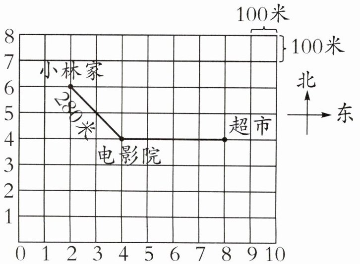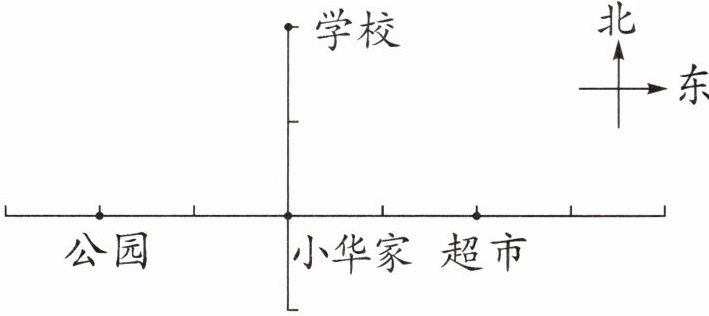 A [提示]学校与小华家相距两格,是1000米,所以每格代表500米,从家向东走1200米,就是两格多一些,到了超市的右侧,也就是超市的东面。
