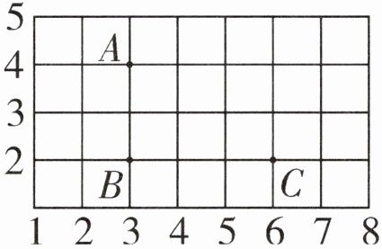 1. (北京大兴区·符号意识)下面的方格图中有三个点,其中点A的位置用数对表示是$(3,4)$,找到一点D,使得顺次连接四个点可以围成一个长方形。点D的位置用数对表示是(