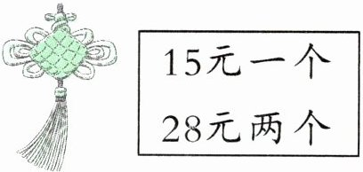 7.100÷28=3(组)……16(元) 16>15 3×2+1=7(个) 16−15=1(元)最多可以买7个这样的中国结,还剩1元。[提示]根据中国结的价格可知,两个两个地买单价更低,因此尽量买2个装的,先用100÷28,商是几,就能买几组2个装的,再看余数是否比15大,如果比15大,那么看余数有几个15,就还能买几个。