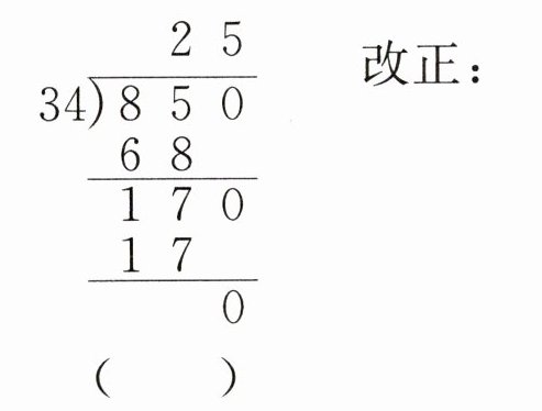 $\begin{array}{r} 25\\ 34\enclose{longdiv} {850}\\ 68\\ \hline 170\\ 17\\ \hline 0\end{array} $