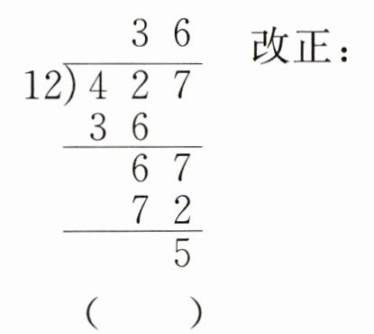 $\begin{array}{r} 36\\ 12\enclose{longdiv} {427}\\ 36\\ \hline 67\\ 72\\ \hline 5\end{array} $