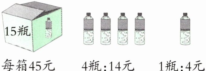 【提示】根据“总价÷数量=单价”,分别算出整箱买时每瓶饮料的价格和4瓶一组地买时每瓶饮料的价格,再与单买1瓶的价格进行比较,发现整箱买比较合算,尽量先整箱买,再整组买,这样花的钱较少。