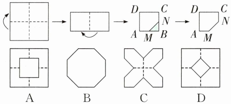 5. 如图,将一张正方形纸片由下向上对折压平,再由右向左对折压平后,得到正方形ABCD,取AB的中点M和BC的中点N,剪掉三角形MBN得到五边形AMNCD。将折叠的五边形展开铺平后得到的图形是(