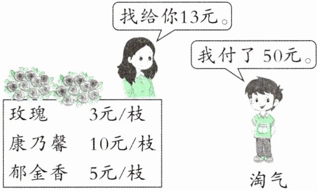 10. 实验班原创 推理意识 母亲节是一个为感谢母亲而庆祝的节日,时间为每年 5 月的第二个星期日,这一天母亲们通常会收到孩子们赠送的礼物,比如说一束美丽的鲜花。淘气准备用自己攒下的零花钱去花市买一束鲜花给妈妈一个惊喜。淘气买了一些康乃馨和郁金香,老板找回的钱数对吗? 说明理由。