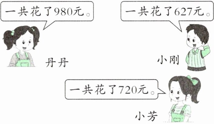 小芳算得对。因为有2个年级,每个年级都有3个班,每瓶饮料5元,所以老师花的钱数一定是2,3,5的倍数。这三个钱数中,只有720是2,3,5的倍数,因此只有小芳算得对。【提示】因为2,5的倍数的个位上的数字是0,所以排除627;9+8+0=17,7+2+0=9,剩下的两个数中只有720是3的倍数。