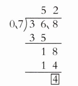 (3)有一根36.8长米的彩带,剪成0.7米长的包装绳,可以剪成几根? 小明列出了竖式(如下图),竖式里方框中的“4”表示(
