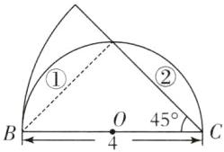 [提示]如下图,可将原图进行分割,则空白①和涂色部分②的面积相等,则涂色部分的面积等于半径为4厘米、圆心角为 $45^{\circ}$的扇形面积减去底边长为4厘米高为$(4÷2)$厘米等腰直角三角形面积。