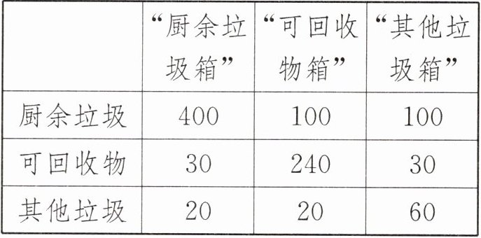 7. 新情境 垃圾分类 近年来,某市为了促进生活垃圾的分类处理,将生活垃圾(除有害垃圾)分为厨余垃圾、可回收物和其他垃圾三类,并分别设置了相应的垃圾箱,为调查居民生活垃圾分类投放情况,现抽取了该市三类垃圾箱中总计1000吨生活垃圾,数据统计如下。(单位:吨)