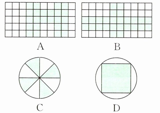 3.A 【提示】选项A中,涂色部分占整幅图的24÷50=0.48=48%;选项B中,涂色部分占整幅图的26÷50=0.52=52%;选项C中,涂色部分占整幅图的4÷8=0.5=50%;选项D中,设圆的半径为1,圆的面积为3.14×1²=3.14,正方形的面积为1×2=2,涂色部分占整幅图的2÷3.14≈0.64=64%。