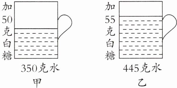 9. 有甲、乙两个杯子,杯中的水分别为350克和445克。黄老师分别给这两杯水中加入50克和55克的白糖(全部溶解)。哪一杯的糖水含糖率高?请你算一算。