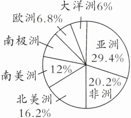 【提示】观察题中统计图,亚洲和非洲的陆地面积之和占地球陆地总面积的29.4%+20.2%=49.6%,接近50%。