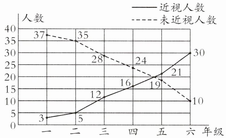 2. 下图是某班学生从一年级到六年级近视人数和未近视人数统计图。