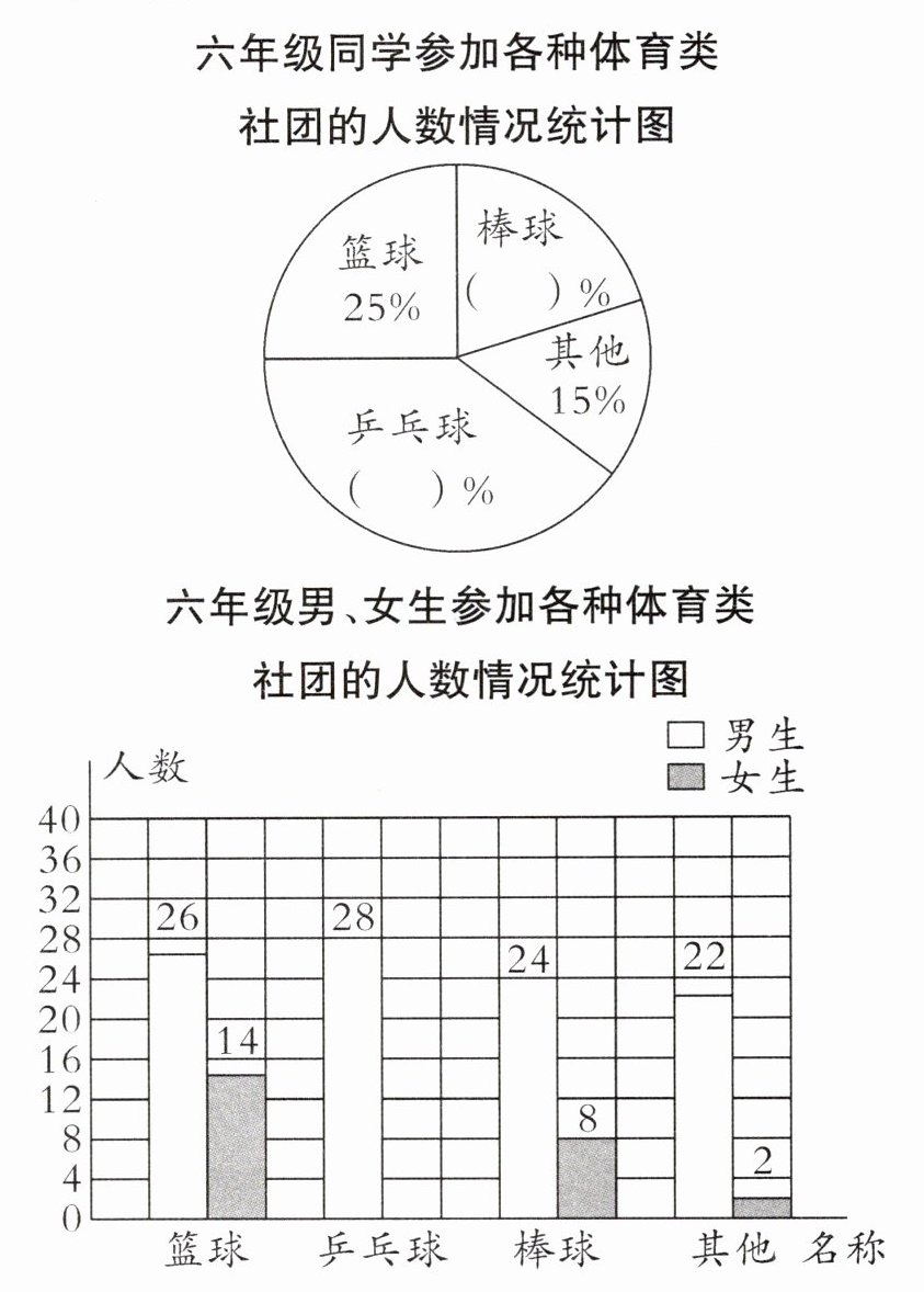(2)六年级参加各种体育类社团的同学中,男生有( )人,比女生人数多( )%。(百分号前保留一位小数)