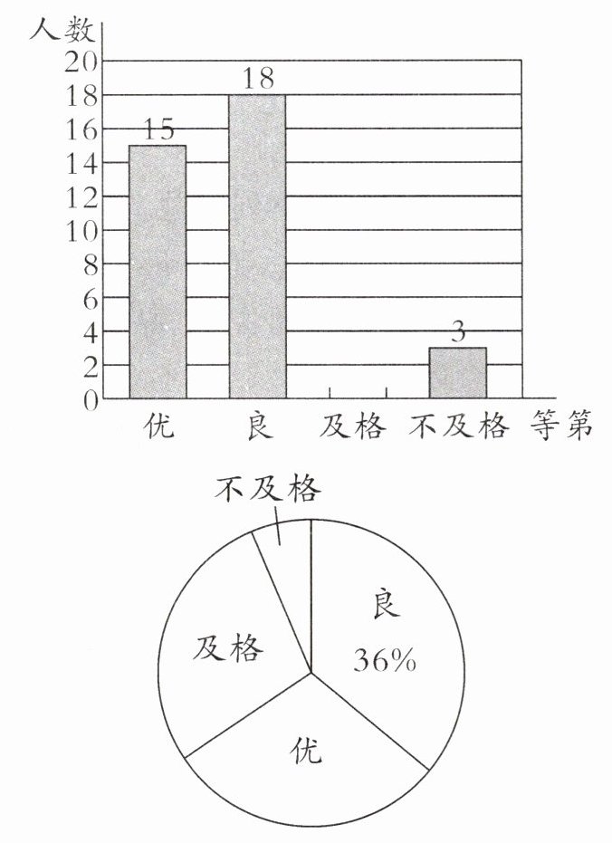 (1)50 30 【提示】观察两幅统计图可知:成绩得良的学生有18人,占全班人数的36%,全班人数有18÷36%=50(人);成绩得优的有15人,占全班人数的15÷50×100%=30%。