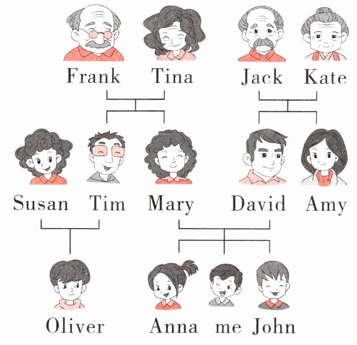 @@1.由图可知,Oliver 有一个大家庭,故选 B。2.由图可知,Frank 是 Oliver 的爷爷,故选 A\。3.由图可知,Tina 是 Oliver 的奶奶,故选 D。4.由图可知,David 是 Oliver 的姑父,故选 H。5.由图可知,Tim 是 Oliver 的爸爸,故选 F。6.由图可知,Mary 是 Oliver 的姑妈,故选 I。7.由图可知,John 是 Oliver 的表兄弟,故选 E。8.由图可知,Anna 是 Oliver 的表姐妹,故选 G。