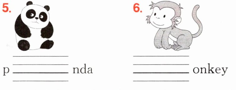 三、根据图片提示,补全单词,将所缺字母写在图片下面的四线三格内。
