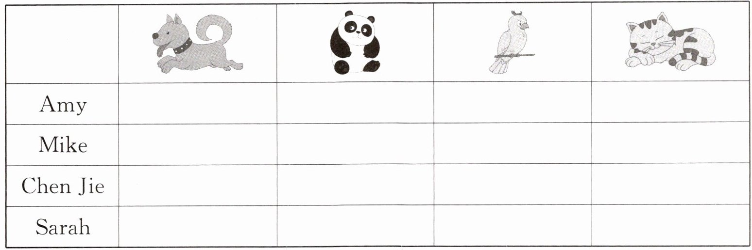 Amy:狗 Mike:熊猫 Chen Jie:鸟 Sarah:猫 阅读对话可知,埃米有一条狗,迈克有一只玩具熊猫,陈杰有一只鸟,萨拉有一只猫。