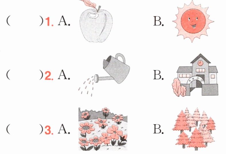 B 3. 句意:我们是植物。我们需要 。选项A与选项C都属于植物,选项B是阳光,符合句意,故选B。