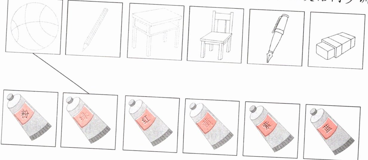 (1. 桌子连线黄色。 2. 铅笔连线蓝色。 3. 橡皮连线紫色。 4. 椅子连线红色。 5. 钢笔连线粉色。)
