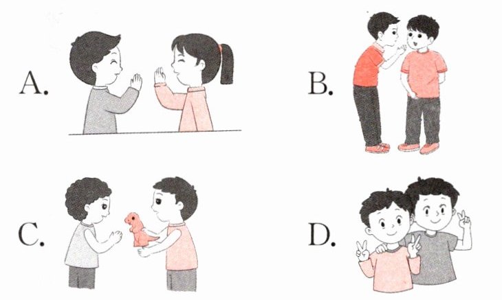 1~4 B A D C 1.句意:我倾听。图片B是的男孩在倾听朋友说话,故选B。2.句意:我说"你好"和"再见"。图片A是两个小朋友笑着打招呼,故选A。3.句意:我对我的朋友友好。图片D是两个好朋友在一起,故选D。4.句意:我分享我的玩具。图片C是两个男孩在分享恐龙玩具,故选C。