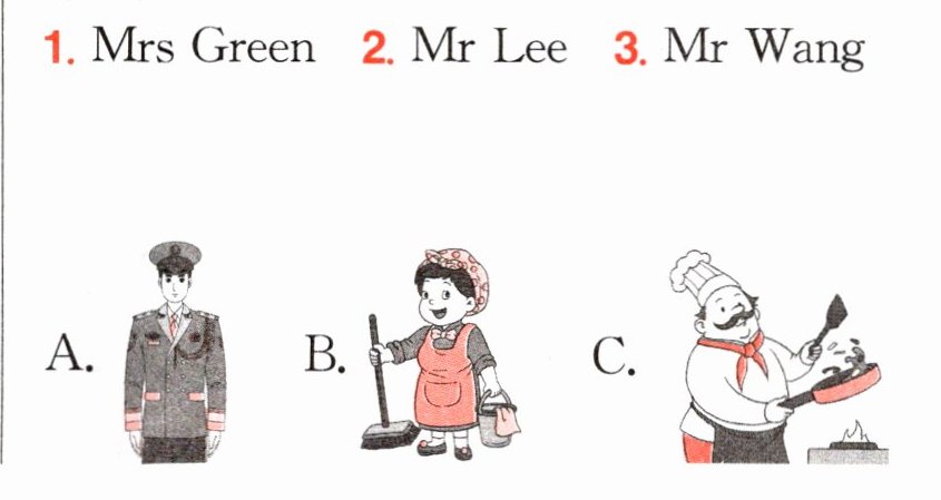 Mrs Green is a cleaner. She sweeps the streets and parks. She keeps our community clean. Mr Lee is a cook. He works in a small restaurant. He cooks nice food. Mr Wang is a police officer. He keeps us safe. He helps people in trouble(处于困难中) and catches bad guys(抓坏人).