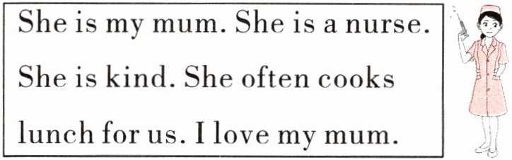 She is my mum. She is a nurse. She is kind. She often cooks lunch for us. I love my mum.