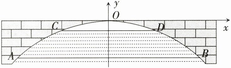 10. 教材探究改编 如图所示,一座抛物线形拱桥在正常水位时,水面$AB$宽为20 m,拱桥的最高点$O$到水面$AB$的距离为4 m. 如果此时水位上升3 m就达到警戒水位$CD$,那么$CD$宽为
