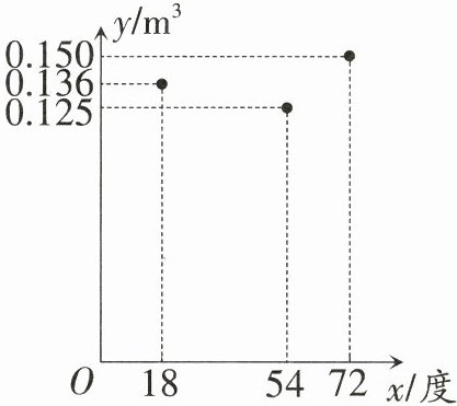 7.〔郑州模拟〕使用家用燃气灶烧开同一壶水所需的燃气量$ y $(单位:$ \mathrm{m}^{3} $)与旋钮的旋转角度$ x $(单位:度)$ (0 < x \leqslant 90) $近似满足函数关系$ y = ax^{2} + bx + c(a \neq 0) $.图中记录了某种家用节能燃气灶烧开同一壶水旋钮的旋转角度$ x $与所需燃气量$ y $的三组数据.根据上述函数模型和数据,可推断出此燃气灶烧开一壶水最节省燃气的旋钮的旋转角度可能为下列选项中的 (