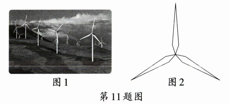 11. 日常生活情境 风力发电机叶片 风力发电机(图1)可以在风力作用下发电.如图2,转子叶片图案绕中心旋转n°后能与原来的图案重合,那么n的最小值是
