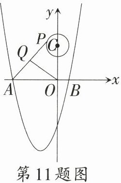 11. 如图,抛物线$y = (x + 4)(x - 1)$与$x$轴交于$A,B$两点,$P$是以点$C(0,3)$为圆心,$1$为半径的圆上的动点,$Q$是线段$PA$的中点,连接$OQ$,则线段$OQ$的最小值是