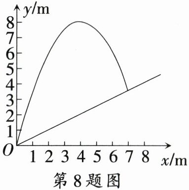 8.〔唐山市〕如图,将一个小球从斜坡的点$O$处抛出,小球的抛出路线可以用抛物线$y = 4x - \frac{1}{2}x^2$刻画,斜坡可以用直线$y = \frac{1}{2}x$刻画.下列结论错误的是