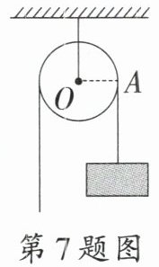 7. 跨学科 物理 如图,一个固定的圆形滑轮起重装置的半径是$10 cm$,当重物上升$12.56 cm$时,滑轮的一条半径$OA$绕轴心$O$按逆时针方向旋转的角度为($\pi \approx 3.14$) (