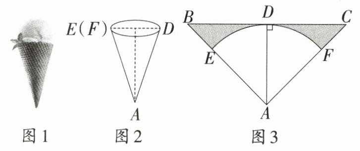 10. 〔唐山市〕某种食物(图1)的外包装可以视为圆锥(图2),它的底面圆直径ED与母线AD长之比为$ 1:2 $,制作这种外包装需要用如图3所示的等腰三角形材料,其中$ AB = AC $,$ AD \perp BC $.将扇形AEF围成圆锥时,AE,AF恰好重合.