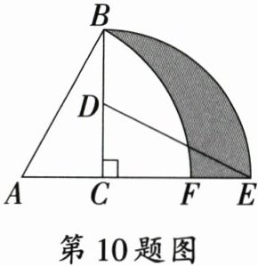 10.[安阳市改编] 如图,在$ Rt\triangle ABC$中,$\angle ACB = 90^{\circ}$,$AC = 1$,$\angle A = 60^{\circ}$,将$ Rt\triangle ABC$绕点C顺时针旋转$90^{\circ}$后得到$ Rt\triangle DEC$,点B经过的路径为$\overset{\frown}{BE}$,将线段AB绕点A顺时针旋转$60^{\circ}$后,点B恰好落在CE上的点F处,点B经过的路径为$\overset{\frown}{BF}$,则图中阴影部分的面积是 (