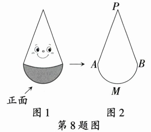 8.[河北中考] 某款“不倒翁”(图1)从正面看如图2所示,PA,PB分别与$\overset{\frown}{AMB}$所在圆相切于点A,B. 若该圆半径是9 cm,$\angle P = 40^{\circ}$,则$\overset{\frown}{AMB}$的长是 (