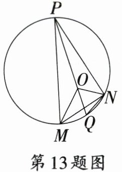 13. 如图,点O是$\triangle PMN$的内心,$PO$的延长线和$\triangle PMN$的外接圆相交于点Q,连接$NQ$,$MO$,$NO$. 若$\angle MNQ = 15^{\circ}$,则$\angle MON$的度数为