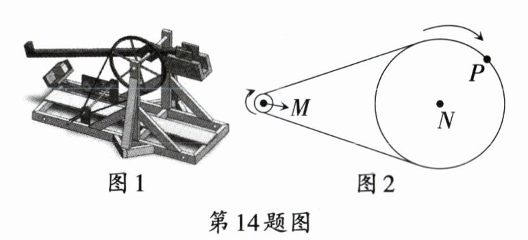 14.[兰州中考] “轮动发石车”是我国古代的一种投石工具,在春秋战国时期被广泛应用,图1是陈列在展览馆的仿真模型. 图2是模型驱动部分的示意图,其中⊙M,⊙N的半径分别是1 cm和10 cm,当⊙M顺时针转动3周时,⊙N上的点P随之旋转$n^{\circ}$,则$n =$