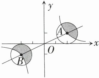 4. 如图,正比例函数与反比例函数的图象相交于$A,B$两点,分别以点$A,B$为圆心,画与$x$轴相切的两个圆. 若点$A$的坐标为$(2,1)$,则图中阴影部分面积的和是 (