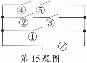 15. 跨学科 物理 如图,电路图上有编号为①②③④⑤的5个开关和1个小灯泡,现有3种方法可使小灯泡发光:闭合开关①、同时闭合开关②③或同时闭合开关④⑤.任意闭合电路上其中的两个开关,小灯泡发光的概率为