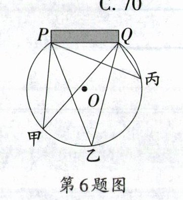 6. 日常生活情境 射门 如图,甲、乙、丙三名同学比赛定点射门,$PQ$是球门,且甲、乙、丙三名同学均位于以点$O$为圆心的同一圆弧上,仅从射门角度考虑的话,进球概率最大的是(