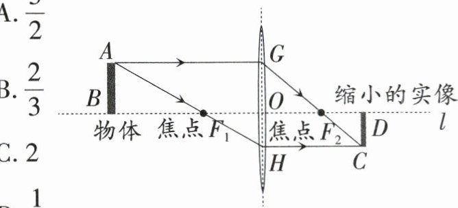 6.〔郑州模拟〕凸透镜成像的原理如图所示,AG//l//HC. 若缩小的实像是物体的$\frac{2}{3}$,则物体到焦点$F_1$的距离与焦点$F_2$到凸透镜的中心线GH的距离的比值为(焦点$F_1$和$F_2$关于点O对称) (