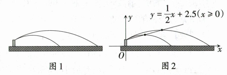 21. 〔洛阳市〕(9分)在一次学校组织的社会实践活动中,小洛看到农田里安装了很多灌溉喷枪,喷枪喷出的水流轨迹是抛物线(如图1),他发现这种喷枪射程是可调节的,且在一定的调节范围内喷射的水流越高射程越远,于是他从该农田的技术部门得到了这种喷枪的一组相关数据,通过研究发现,以地面为$x$轴,以喷枪所在直线为$y$轴,建立平面直角坐标系(如图2所示).设水流的最高点到地面的距离为$y( m)$,水流的最高点与喷枪的水平距离为$x( m)$,且满足$y=\frac{1}{2}x+2.5(x\geqslant0)$.