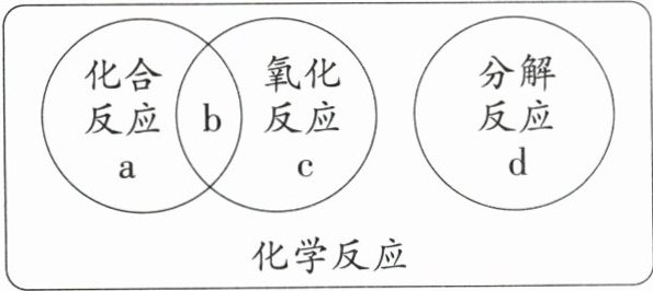3.〔黄冈市〕化学反应有多种分类,化合反应、氧化反应、分解反应的关系可用下图表示,其中b处表示既属于化合反应,又属于氧化反应。现有反应:乙醇 + 氧气$\stackrel{点燃}{→}$ 水 + 二氧化碳,则此反应应该填充到