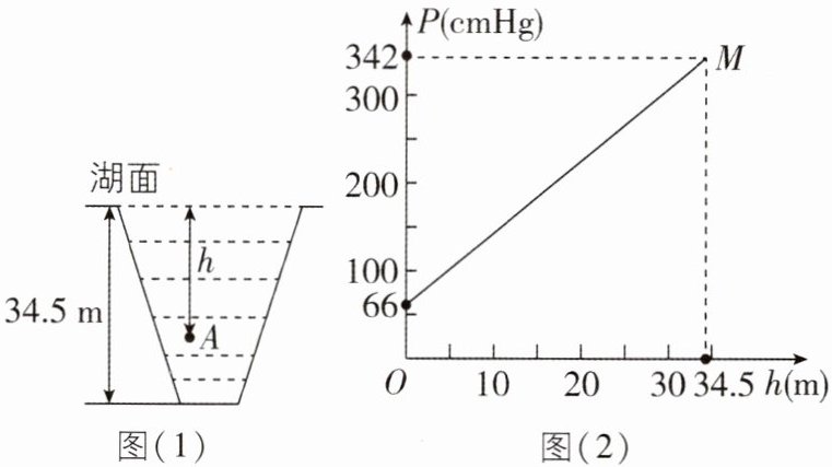 1 [2025 山东济南期中,中]如图(1)是某湖最深处的截面图,湖面下任意一点 A 的压强 P(单位:cmHg)与其深度 h(单位:m)的函数关系式为 P = ah + P₀,其图象如图(2)所示,其中 P₀ 为湖面大气压强,a 为常数且 a > 0,点 M 的坐标为(34.5,342).根据图中信息分析,下列结论正确的是( )