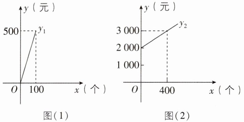 方案二:租赁机器自己加工,所需费用(包括租赁机器的费用和生产包装盒的费用$)y_2($元)与包装盒数 x(个)满足如图(2)所示的函数关系.