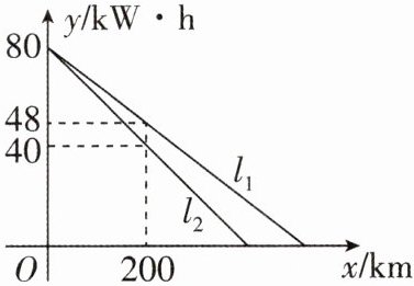 6 [2024山东济南中考]某公司生产了$A$,$B$两款新能源电动汽车.如图,$l_{1}$,$l_{2}分别表示A$款,$B款新能源电动汽车充满电后电池的剩余电量y(\text{kW}\cdot\text{h})与汽车行驶路程x(\text{km})$的关系. 当两款新能源电动汽车的行驶路程都是$300\text{km}$时,$A款新能源电动汽车电池的剩余电量比B$款新能源电动汽车电池的剩余电量多______$\text{kW}\cdot\text{h}$.