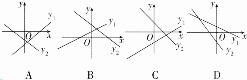 3.C [解析]A选项,因为一次函数y₁=ax+b的图象经过第一、三、四象限,所以a>0,b<0,而由一次函数y₂=bx+a的图象可知,b<0,a<0,矛盾,故本选项错误;B选项,因为一次函数y₁=ax+b的图象经过第一、二、三象限,所以a>0,b>0,而由一次函数y₂=bx+a的图象可知,a>0,b<0,矛盾,故本选项错误;C选项,因为一次函数y₁=ax+b的图象经过第一、三、四象限,所以a>0,b<0,而由一次函数y₂=bx+a的图象可知,a>0,b<0,故本选项正确;D选项,因为一次函数y₁=ax+b的图象经过第一、二、四象限,所以a<0,b>0,而由一次函数y₂=bx+a的图象可知,a<0,b<0,矛盾,故本选项错误.故选C.